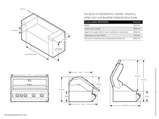 PRODUCT PROFILE Type of BBQBuilt in Finishstainless steel Stainless steel grade443 grade DIMENSIONS Total height (with lid closed) (mm)499 Total height (with lid open) (mm)662 Total height (mm)662 Total width (mm)837 Total depth (mm)568 FEATURES Controls...Sale price $999.00Regular price $1,299.00Sale price $999.00Regular price $1,299.00 -