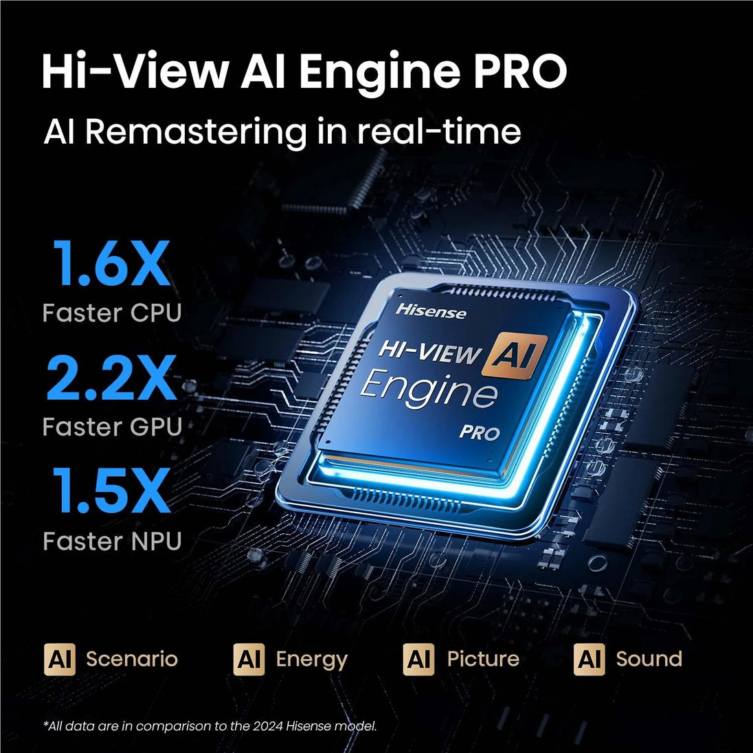 - Powered by the Hi-View AI Engine PRO, this TV brings real-time AI remastering, turning even the simplest scenes into vibrant, lifelike visuals. From skin tones to depth, every detail is enhanced to perfection.