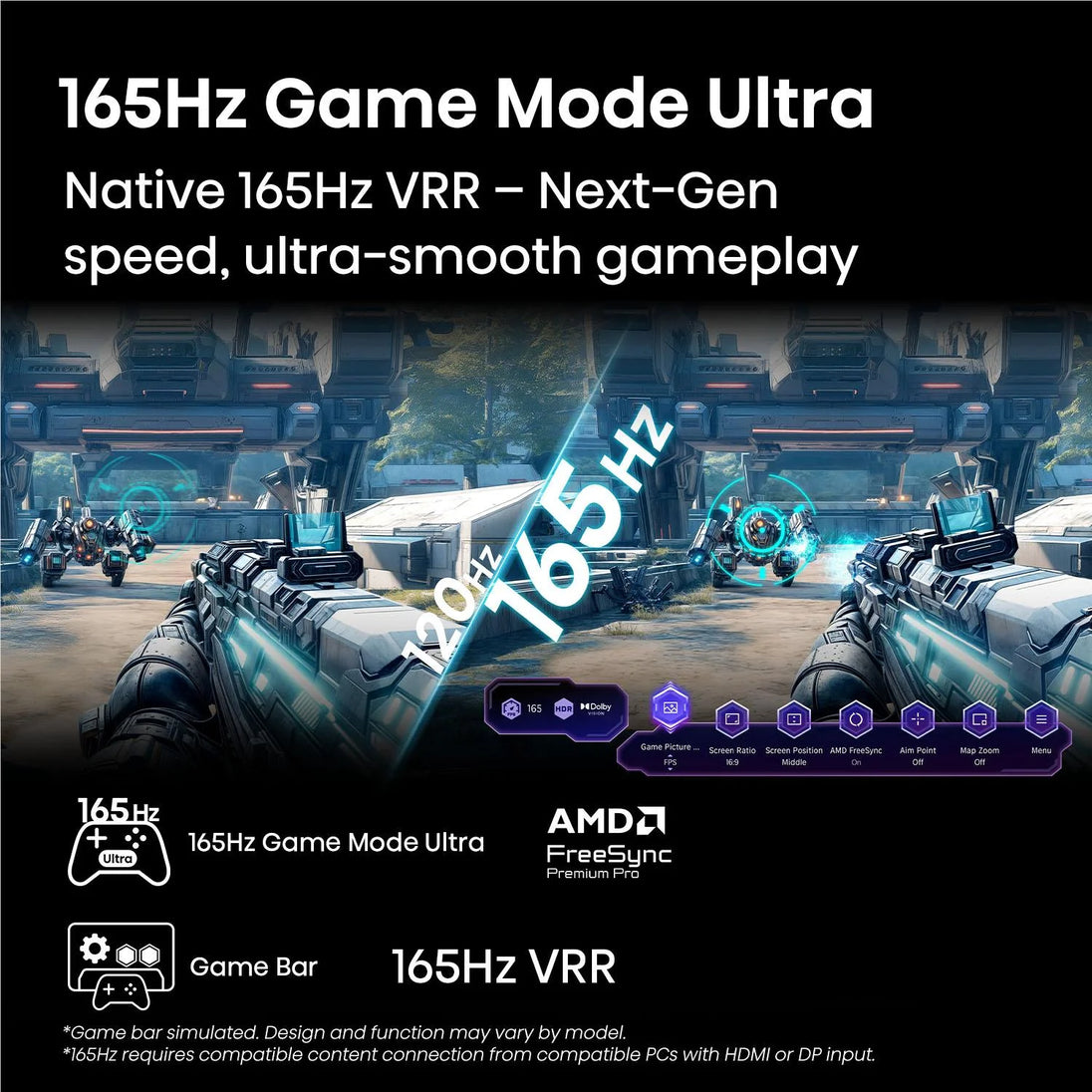- For next-gen gaming, the 165Hz Game Mode Ultra offers ultra-smooth gameplay with native 165Hz VRR, ensuring you stay ahead of the competition with fluid, responsive action.
