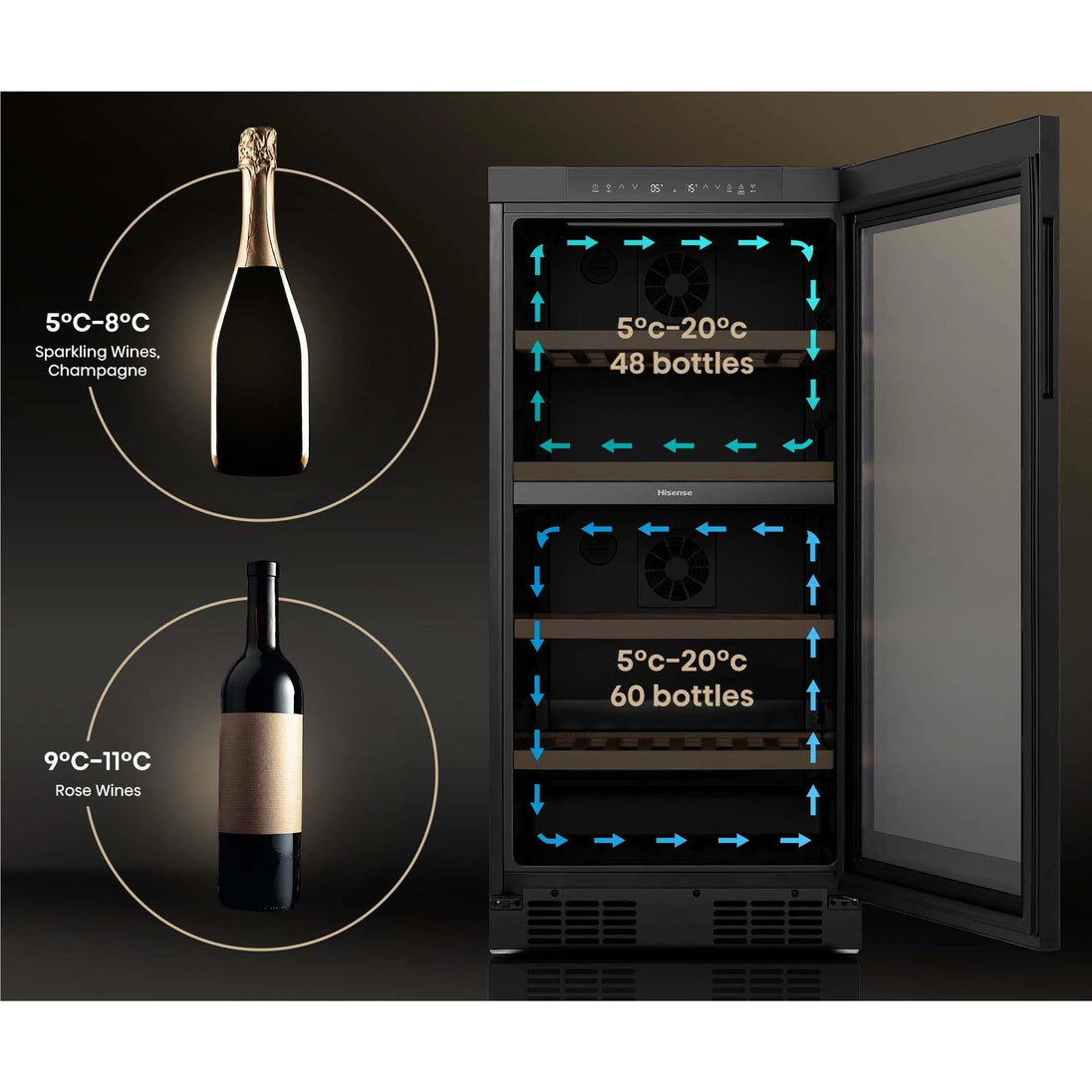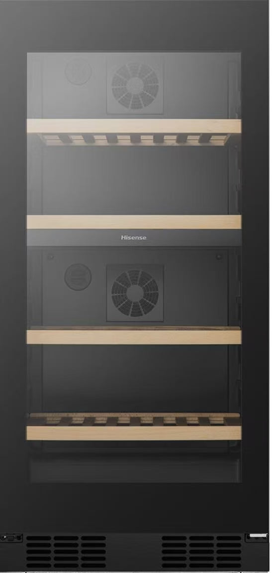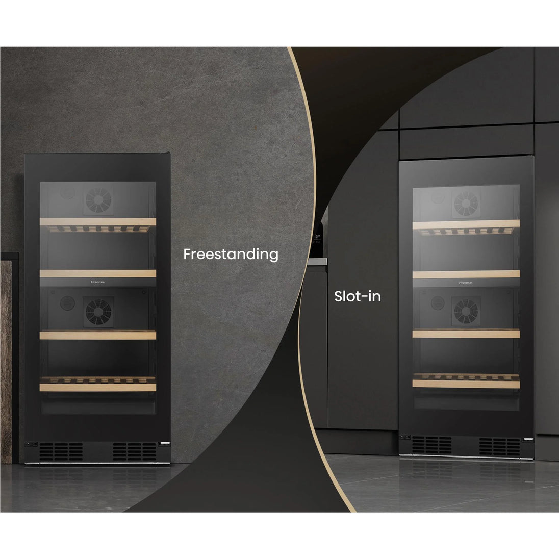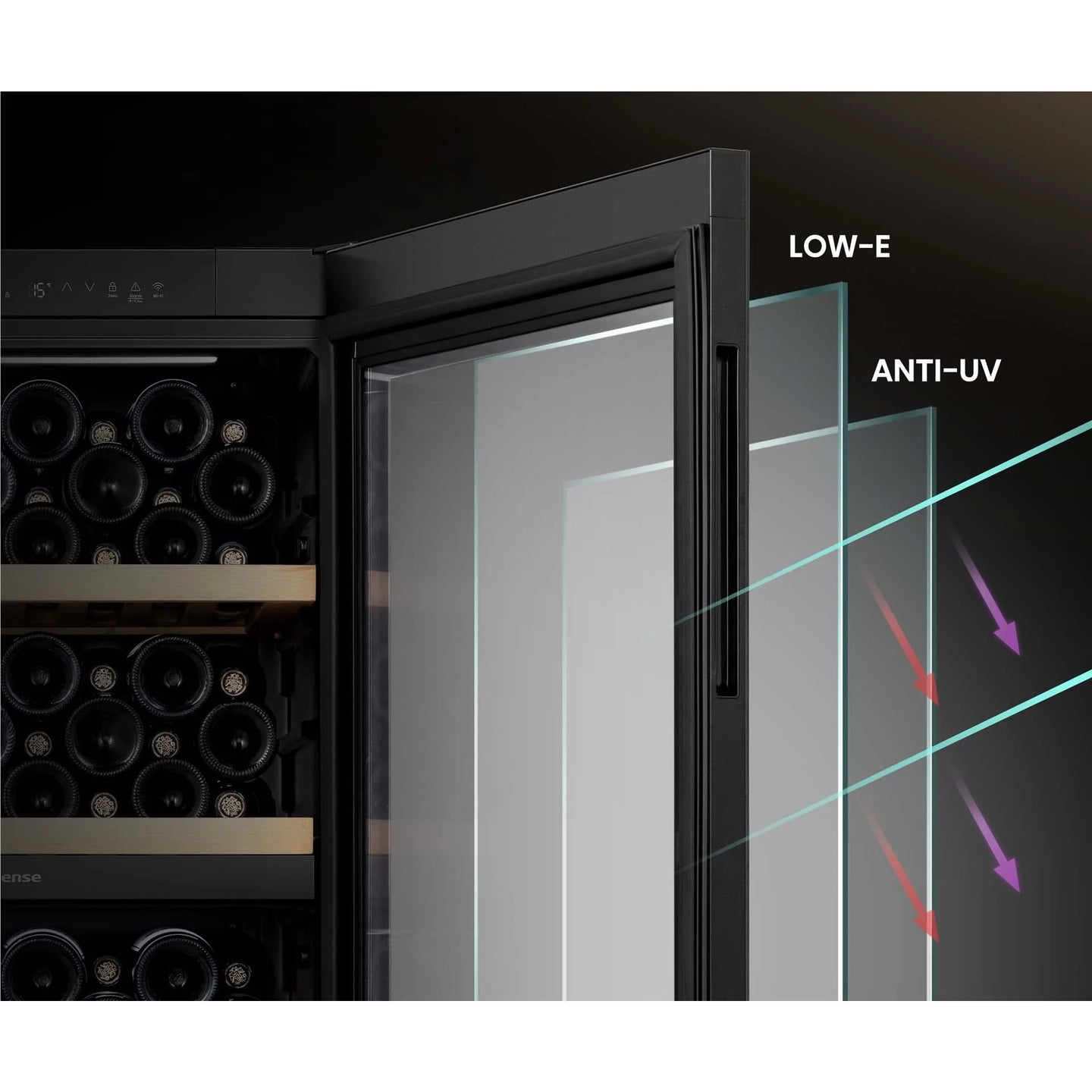 Hisense 108-bottle wine cooler has a sleek and modern design with stainless steel door frame and handle. Its triple glazed glass stores your favourite wine at the perfect temperature. Dual temp zone lets you control the upper and lower zones independently, ranging from a refreshing 5°C to a cozy 20°C. The wine cooler can be installed for built-in applications or as a freestanding model. The reversible door design allows for flexible installation and placement.