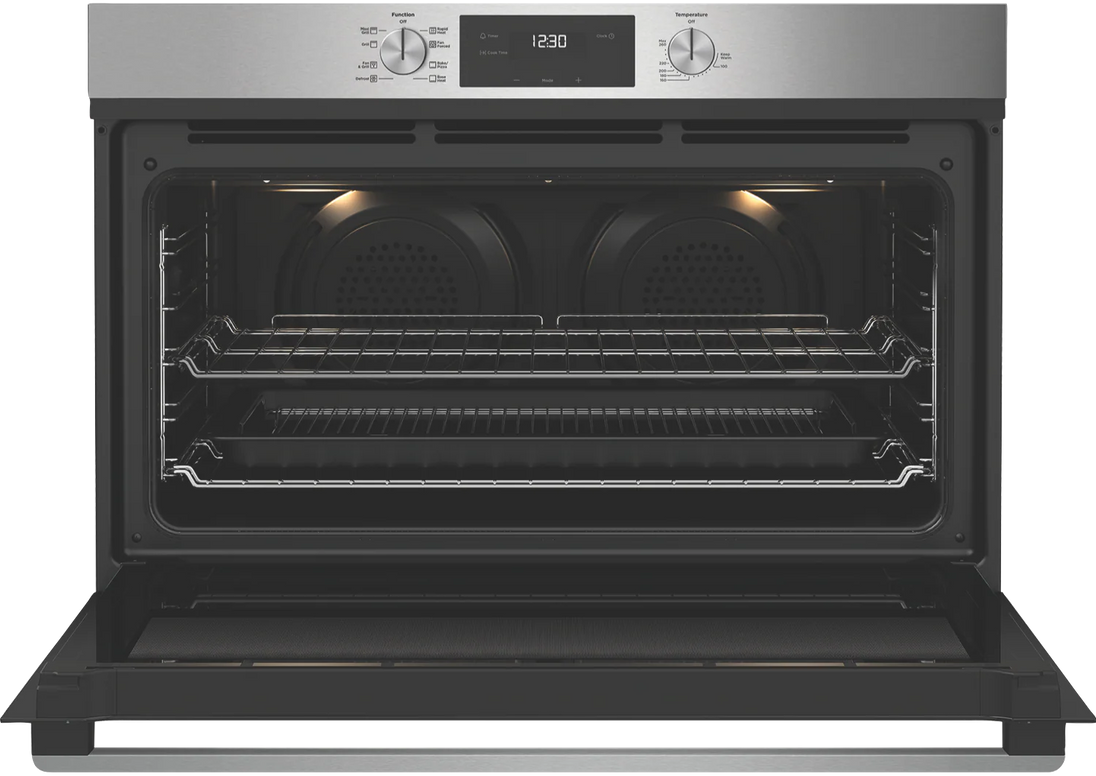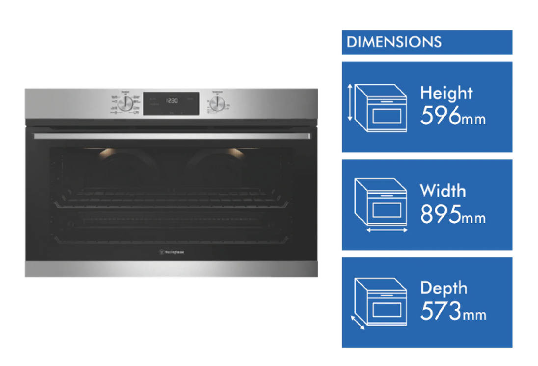 Shelf support side rack Door removable door,removable inner glass panes,drop down Timer 3 button touch control programmable timer Lights 2 Light position top Number of shelves 2 Safety features cool door Closed door grilling Yes Included accessories 2 x chromed wire shelf,grill insert,grill/oven pan,side racks Layers of glass in door 3 Number of shelf positions 5 Oven liner pyrolux high temperature enamel Oven Functions grill,defrost,base heat,fan grill,rapid heat,fan forced cooking,bake/pizza,Light Number of functions 8 Oven function multifunction Useable capacity litres 116 Gross capacity litres 125 Connected load KW 3.6 Maximum current rating (amps) 15 Type of connection hardwired Maximum current rating Amps 15 Domestic warranty details (yrs) 1 Controls of Oven 3 button touch control LED,control knob Materials/Colour mark resistant stainless steel Oven fuel electric Type of Oven single oven Flush fit cut out depth (mm) 581 Flush fit cut out width (mm) 900 Flush fit cut out height (mm) 600 CM Tech data (cm) 90 Total depth (mm) 573 Total width (mm) 895 Total height (mm) 596