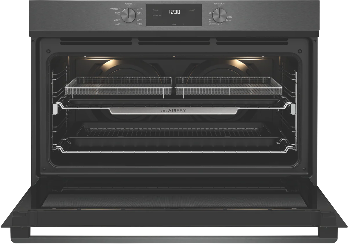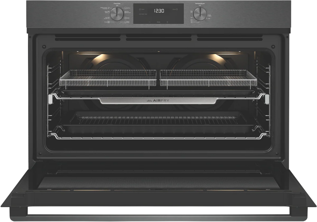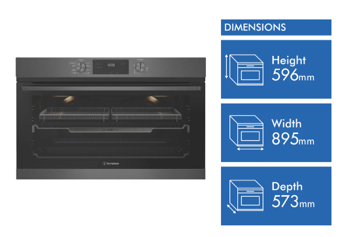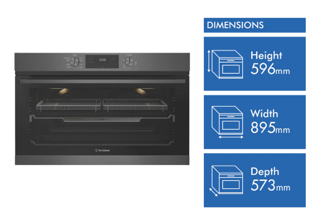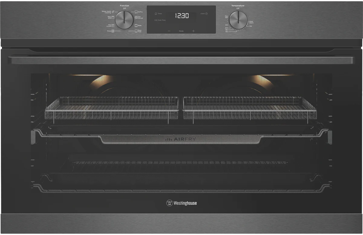 90cm multi-function 8 oven with AirFry, dark stainless steel90cm multi-function 8 dark stainless steel oven with AirFry, telescopic runners, twin fan, and 125L gross capacity.Even cooking twin fan systemOur twin fan system that works to evenly distribute heat throughout the oven so you can enjoy delicious results every time.Dinner's done sooner with our fast heat up ovenWhy wait longer? Our fast oven heat up means you can get on with the job of getting dinner on the table sooner.ACCESS ALL AREAS WITH EASETelescopic runners make it easy for you to slide trays in and out of the oven. This provides safe, effortless access, making it easier to baste during cooking or check on how a dish is coming along. The runners also make light work of lifting and removing hot trays or heavy dishes.All the room for all your family favouritesIf you are serious about creating delicious family feasts and you love entertaining, you'll be right at home with our 90cm oven with a generous 125L gross capacity. That's plenty of room for the biggest Christmas turkey or a weekend roast for all the family. The extra width makes getting things in and out super easy.Built in AustraliaWestinghouse, has been the heart of the home for generations and the kitchen appliance brand we have always known and trusted to build reliable products. This oven is built in a local factory in Adelaide.Place your shelves in with easeOur easy guide side racks allow you to place your oven shelves in with ease.Features