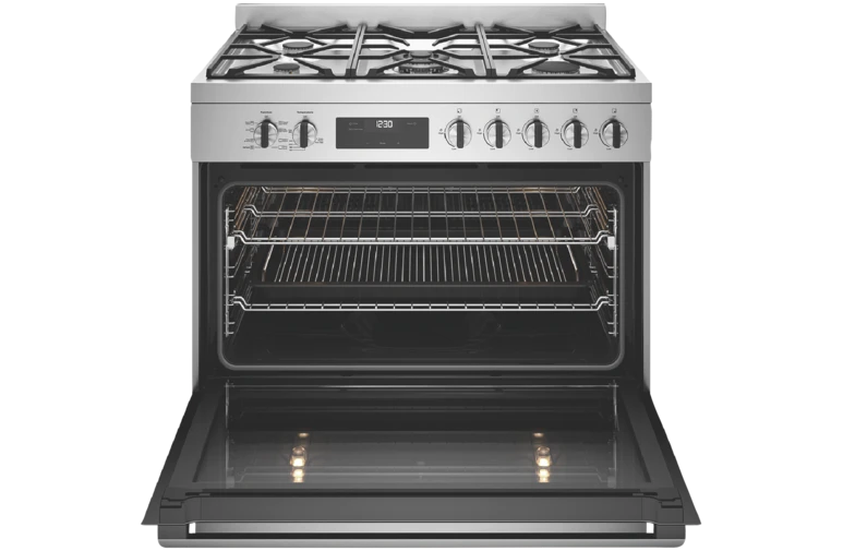 Size: 90cm Colour: Mark Resistant Stainless Steel Capacity: 116L usable Oven Fuel Type: Electric Cooktop Type: Gas Cooktop Fuel Type: Gas No. of Burners: 5 No. of Oven Functions: 8 Oven Functions Type: Maxi grill, Grill, Fan & Grill, Defrost, Rapid Heat, Fan Bake, Bake/Pizza, Base Heat Separate Grill: No Controls: Control knob, 3 button touch control LED Display: Touch Product Width (mm): 895 Product Height (mm): 910 Product Depth (mm): 600 Accessories Included: Clip-on plinth Additional Features: Timer functions: duration,end,minute minder,oven start,Countdown,24 hour clock Manufacturer's Warranty: 1 Year Installation: Must be installed by a licensed professional
