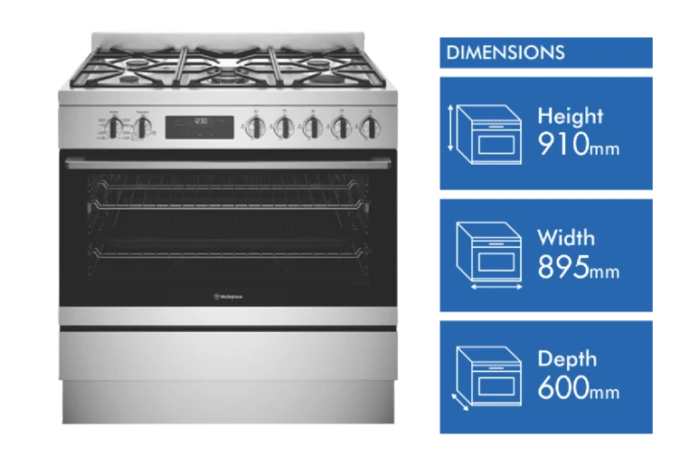 Take your cooking experience to the next level with the Westinghouse 90cm Dual Fuel Freestanding Cooker WFE9515SD. This spacious stainless steel cooker provides the versatility of gas cooktop and electric oven in a sleek freestanding design. Five gas burners give you precise control for searing, simmering or anything in between, while the roomy 116L oven features eight functions like bake, grill and fan forced, easily controlled by intuitive knobs and buttons. Cook dinner and dessert at the same time with separate oven and grill compartments. LED display and minute minder help you stay on top of cooking times. At 90cm wide, this cooker is ideal for larger households that love to cook. The durable stainless exterior keeps its mark resistant good looks over years of use. With a 2 year warranty, you can cook with confidence knowing this Westinghouse dual fuel cooker is built to last. The manufacturer's part number for this product is WFE9515SD. Bring home delicious dinners and family memories with the Westinghouse 90cm Freestanding Dual Fuel Cooker.