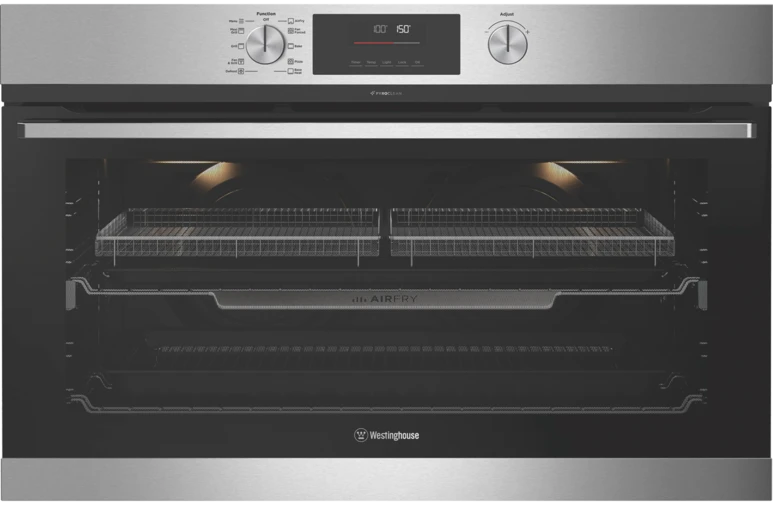 Step into the kitchen of your dreams with the Westinghouse 90cm Fingerprint Resistant Stainless Steel Multifunction Pyrolytic Oven. This spacious 116L capacity oven comes equipped with 10 versatile cooking functions like AirFry, Bake, and Pyroclean to handle all your culinary endeavors. The twin cooling fans provide fast, even heat distribution so you can cook multiple dishes at once. The durable stainless steel finish wipes clean easily and resists fingerprints. The fully programmable timer allows you to cook hands-free. This multifunctional workhorse features a generous 90cm width and includes a telescopic runner, grill rack, baking trays, and moreeverything you need to prepare restaurant-worthy meals at home. With a two-year warranty, this Westinghouse oven brings functionality, durability, and style to your kitchen. The manufacturer's part number for this product is WVEP9716SD. Bring home delicious versatility with the Westinghouse Pyrolytic Oven today.