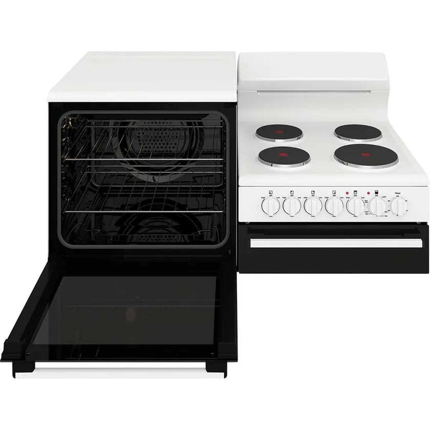| Description | White elevated electric freestanding cooker with separate electric grill, fan forced electric oven, 60 minute timer and 4 zone solid cooktop. |