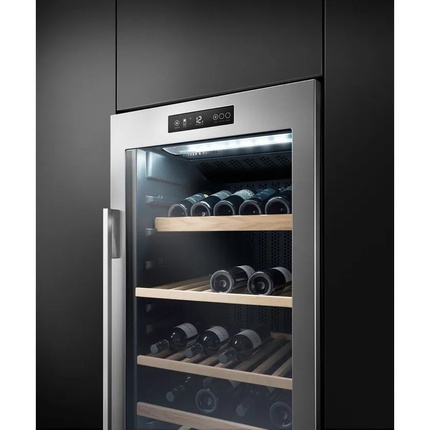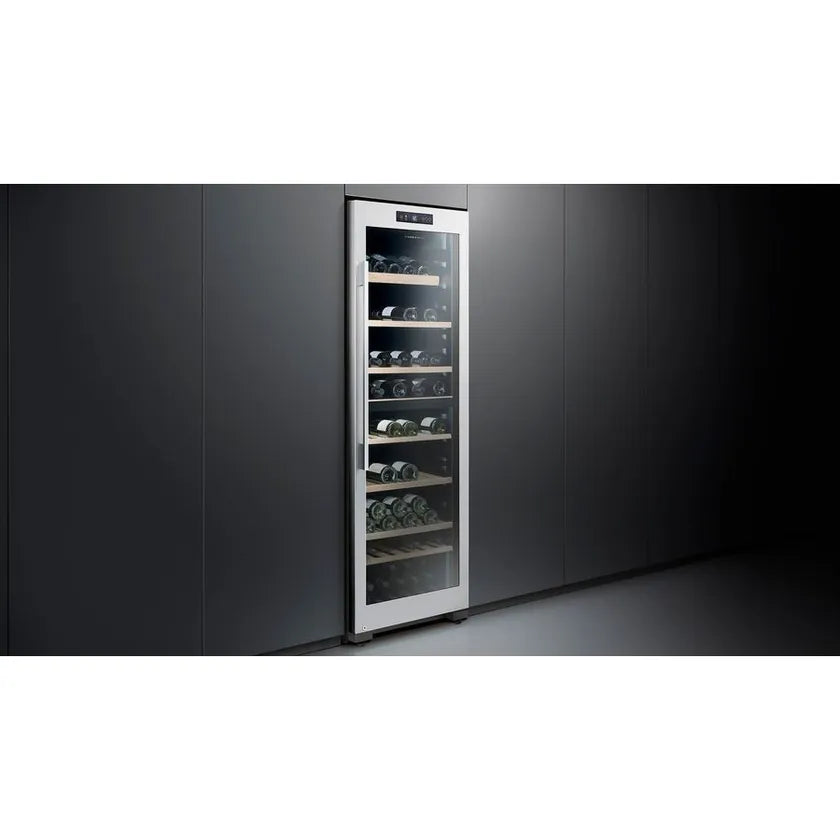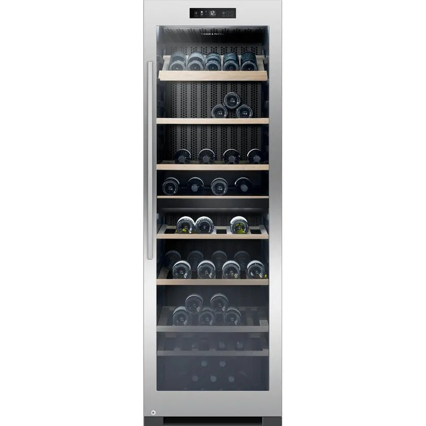 Our wine cabinets are designed to match the Fisher & Paykel family of products with stylish brushed stainless steel and glass doors that complement any kitchen.SpecificationsCapacityNumber of bottles 144 Volume 377L SHOW ALL SPECIFICATIONSFeaturesDoor alarm ● Fixed shelves 2 Flat door design ● LED lighting ● Low vibration compressor ● Removable solid oak shelves 7 Straight designer handle ● Tiltable presentation shelf 1 UV tempered glass door ● Installation DimensionsHeight to top of cabinet 1855 PerformanceAir circulating fans ● Black prepaint cabinet ● Concealed hinges ● Door demist function ● Door lock ● Door opening right hand hinge Dual Zone ● Premium stainless steel and glass door ● Temperature selectable 5-20°C ● Touch sensitive control panel ● SpecificationsBarcode (GTIN) 9415112243626 Product Type Wine Fridges Brand Fisher and Paykel Colour Silver Manufacturers Express Warranty (months) 12 Door Opens to the Right Weight (kg) 0 Product Height (cm) 185.5 Product Width (cm) 59.5 Product Depth (cm) 63.9
