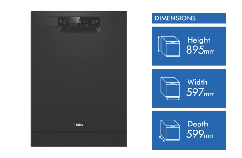 This sleek Haier freestanding dishwasher offers the ultimate in modern convenience. With a generous 15 place settings and 6 wash programs including 60 Min, Auto, Eco, Glass, Heavy and Normal, this appliance can handle even the biggest loads with ease. The adjustable height racks and foldable plate supports provide flexible loading options. While the Eco program helps conserve resources, using only 12.2 litres of water per wash and achieving a high 5 star WELS water rating. With a 4 star energy rating, this dishwasher operates at a quiet 47 decibels. Safety is a priority too, with child lock and flood protection features. Measuring 597mm W x 895mm H x 599mm D, this freestanding dishwasher is Wi-Fi enabled. Allowing you to control and monitor your dishwasher remotely using the SmartHQ app. Helpful alerts provide added peace of mind. With a contemporary black finish and 1 year manufacturer's warranty, this Haier dishwasher delivers exceptional performance. The manufacturer's part number for this product is HDW15F2B1. See the complete range online today