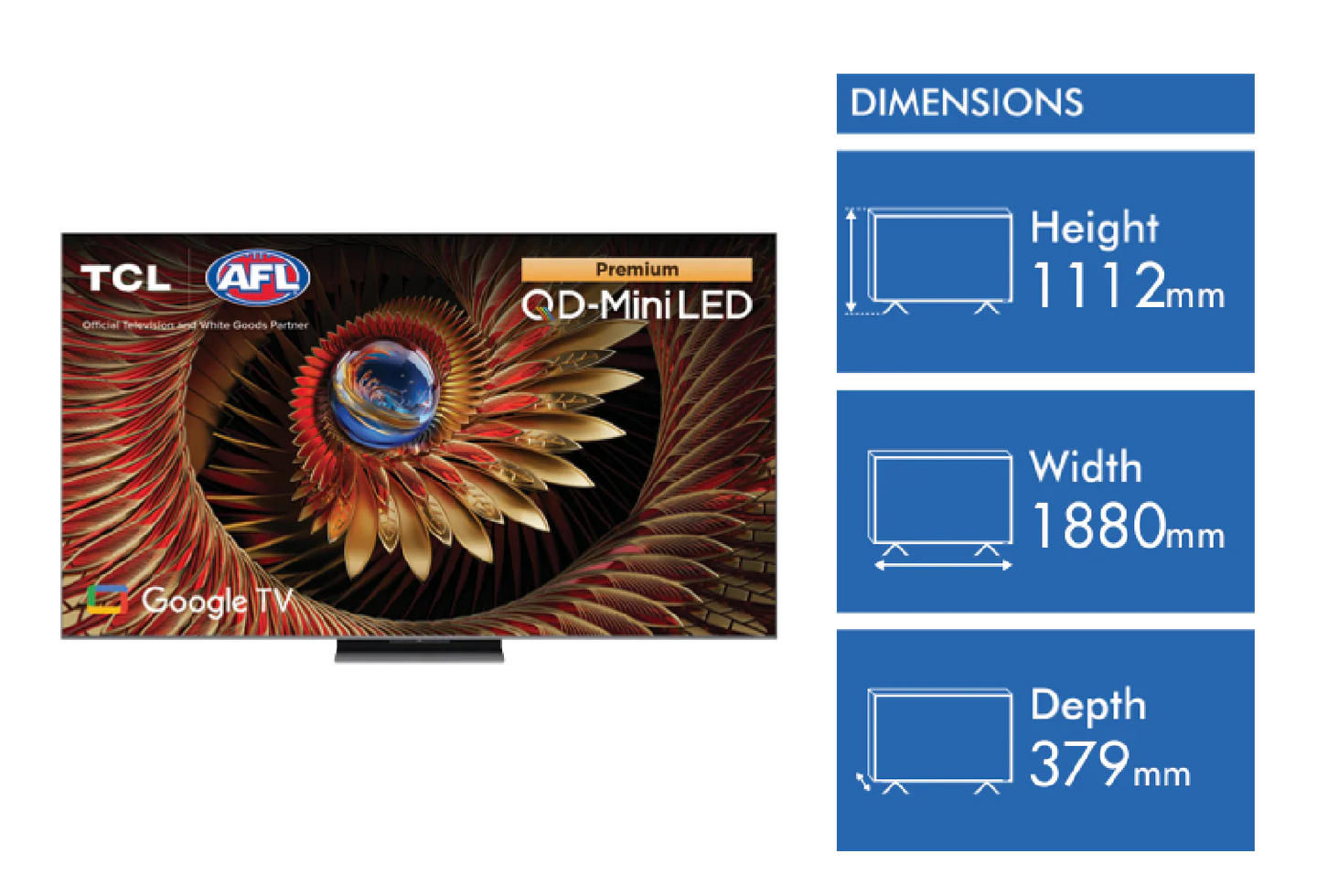 This massive 85-inch Mini LED TV delivers stunning 4K Ultra HD resolution with a peak brightness of 5000 nits, so you'll enjoy incredible clarity and vibrant colours even in bright rooms. The Quantum Dot technology works with the full array backlight to produce a wide colour gamut that makes movies and shows look more realistic. With a 288Hz refresh rate and Freesync Premium Pro compatibility, gaming feels incredibly smooth and responsive. Google TV gives you easy access to all your favourite streaming services, while the 90W sound system provides powerful audio to match the impressive visuals. Includes a 3-year warranty. Model 85C8K.